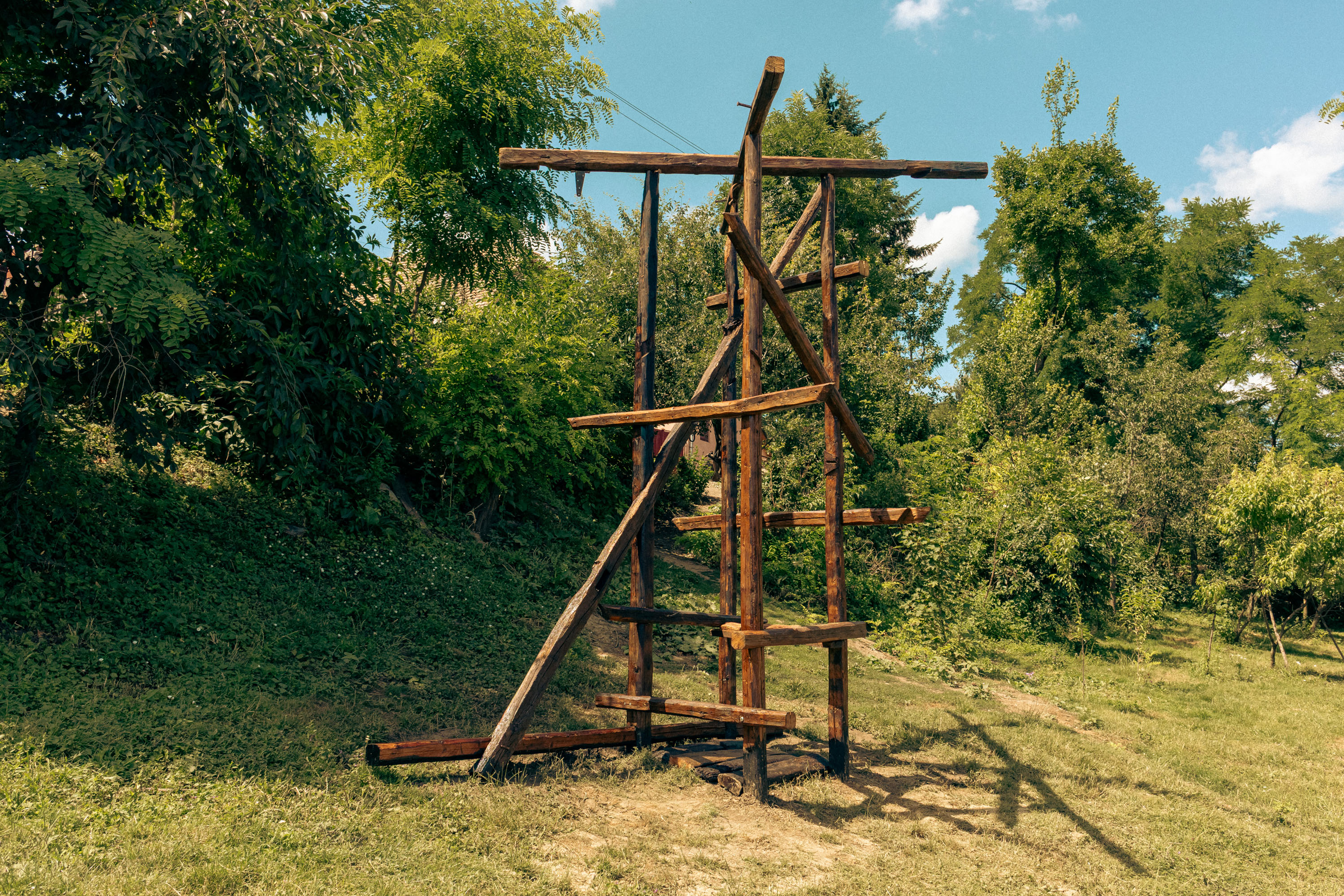 Structura a fost ridicată exclusiv din lemnul unei șuri vechi, demontată și uitată vreme de decenii. Alegerea materialului nu a fost întâmplătoare: în locul lemnului standardizat, de esență moale și străină locului, am preferat să lucrez cu istoria materială a satului, cu urmele și imperfecțiunile unui lemn impregnat de trecut. Chertările existente, urmele diverselor accesorii metalice, toate aceste detalii trădau prezența unor activități umane dispărute, păstrând însă misterul unor fragmente de viață pierdute.
